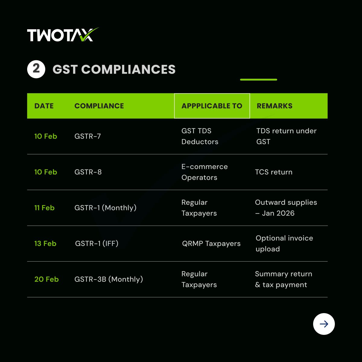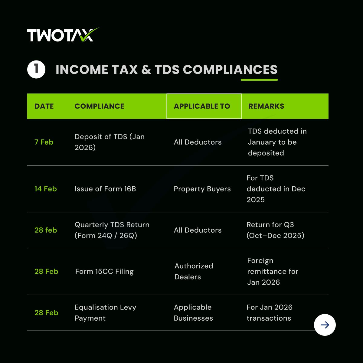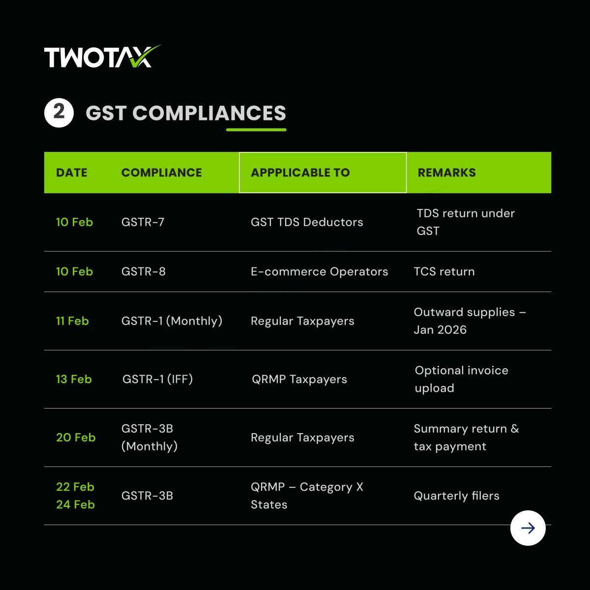 Access the February 2026 Compliance Calendar covering key GST returns, TDS filings, and Income Tax due dates. Plan your tax compliance in advance and avoid late fees with expert guidance from TwoTax