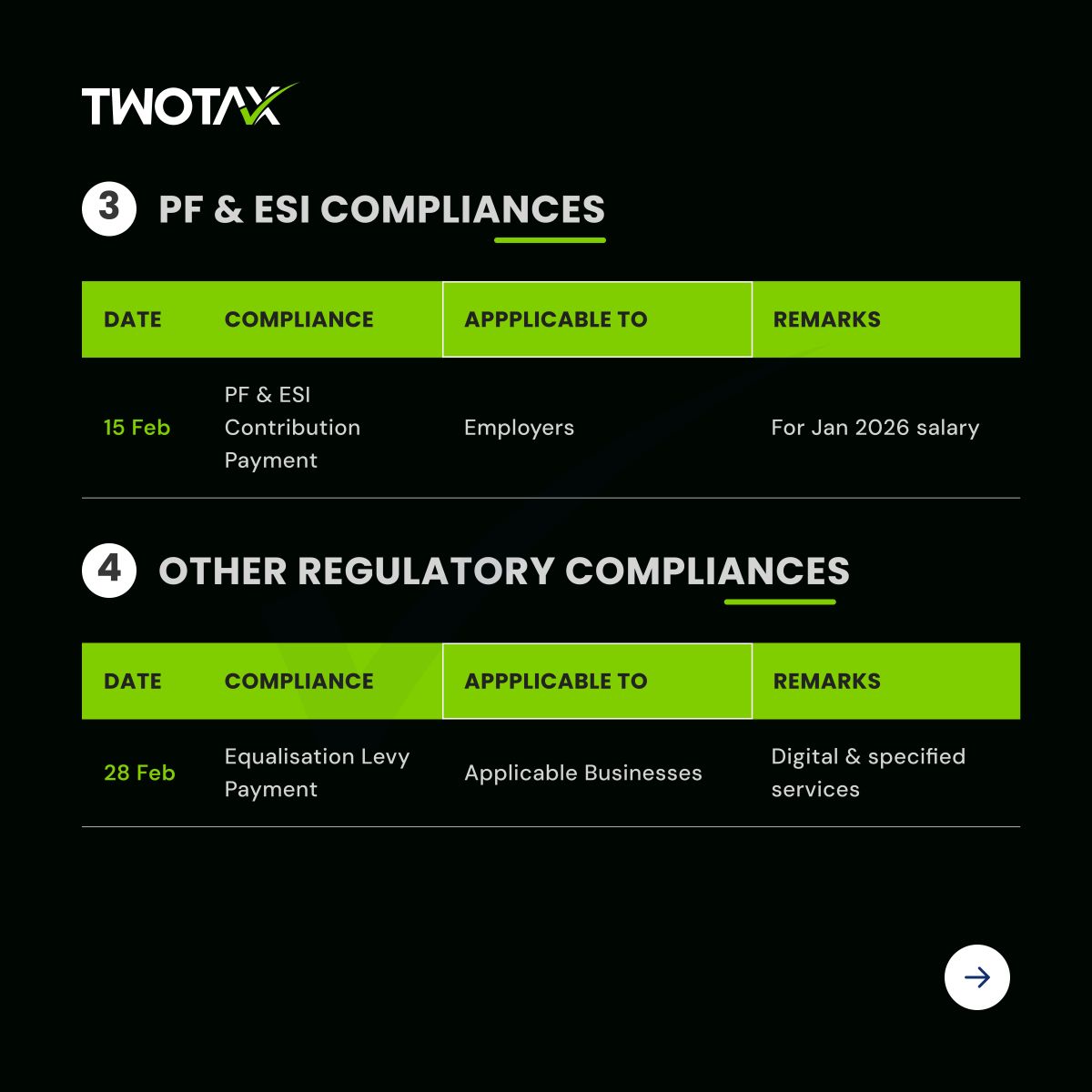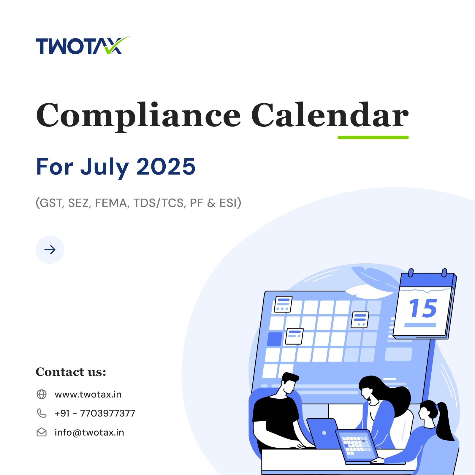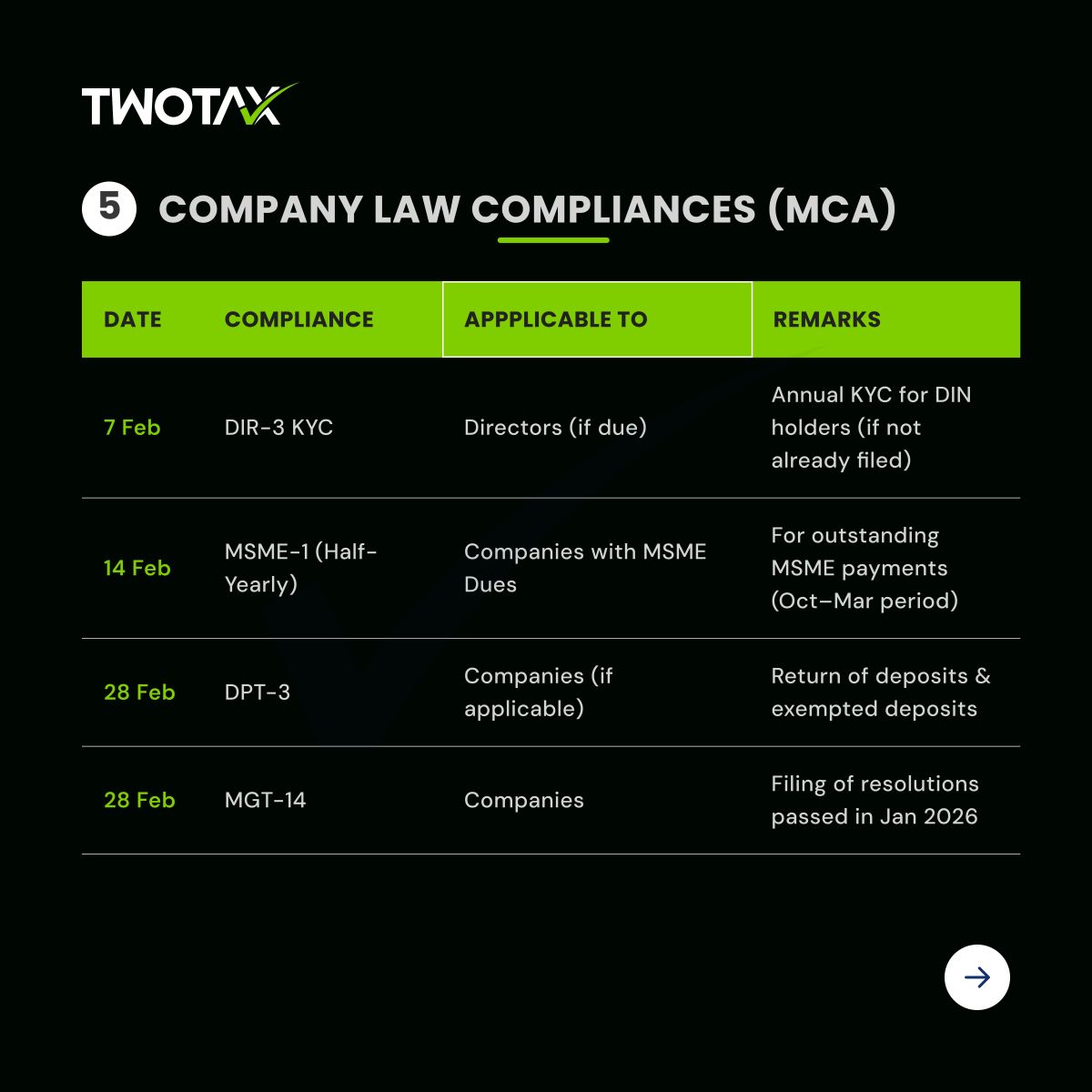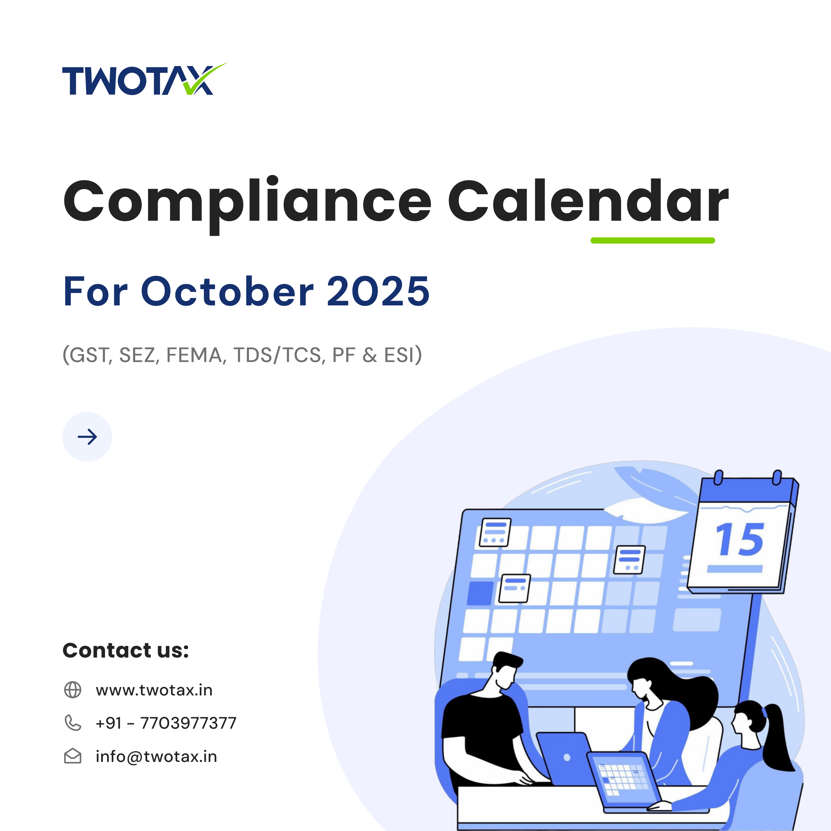 Access the February 2026 Compliance Calendar covering key GST returns, TDS filings, and Income Tax due dates. Plan your tax compliance in advance and avoid late fees with expert guidance from TwoTax